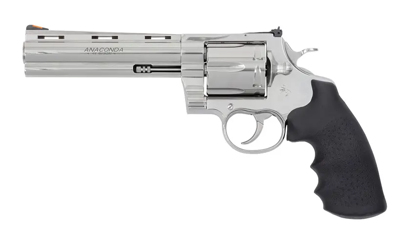 Buy NowColt Mfg, Anaconda, 44 Mag, 6 Round, 6" Barrel, Semi-Bright Stainless Steel, Black Hogue Rubber Grip
